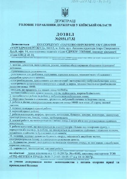 29 ноября 2017 г. Консорциум "НПО "Укргидроэнергобуд" получил Разрешение Главного управления Гоструда в Киевской области на выполнение следующих видов работ: